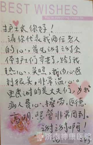 经过一段时间的住院治疗,吴大伯和老伴感觉治疗效果很好,就高高兴兴的出院了,出院这一天,回想起这段时间张院长及二区的大夫、护士对吴大伯的精心治疗,无微不至的贴心服务,老两口从心里感激,于是就写了封感谢信,表达对济南神康医院医护人员的真诚感谢!